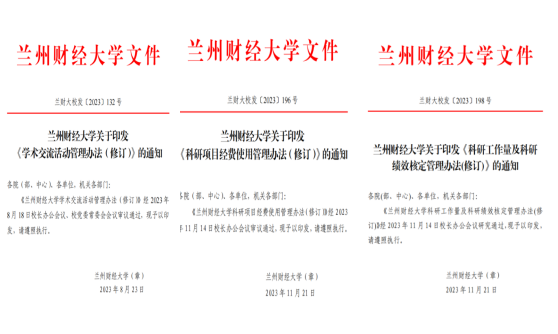 深入贯彻落实“放管服”改革,不断加强科研管理制度完善和修订工作,尽力破除制约科研创新的思想障碍和制度藩篱,新修订《伟德bv1946官网学术交流活动管理办法(修订)》(兰财大校发〔2023〕132号)、《伟德bv1946官网科研项目经费使用管理办法(修订)》(兰财大校发〔2023〕196号)、《伟德bv1946官网科研工作量及科研绩效核定管理办法(修订)》(兰财大校发〔2023〕198号)等文件,构筑以创新价值、能力、贡献为导向的人才激励制度,催生高水平科研成果。