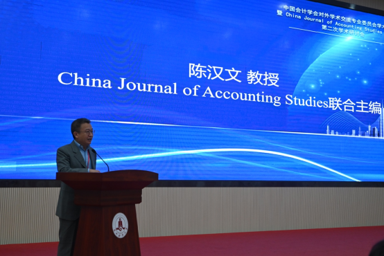 陈汉文在致辞中介绍了CJAS的基本情况与投稿数据,CJAS作为中国会计学会官方主办的英文期刊,创刊12年以来,在传播中国会计学术方面的作用发挥日趋显著。2025年CJAS已收到稿件269篇,其中新投稿件209篇、修回稿件60篇。209篇新投稿件中来自国外40个国家的稿件共134篇,占比64.1%,较去年同期增长15.7个百分点,反映出CJAS的国际影响力不断提升。他介绍了CJAS的审稿周期、选稿要求、研究主题等,通过比较中美资本市场的差异,强调未来CJAS将持续支持立足中国特色情境、回应中国发展实践的多元化、高质量研究,打造具有中国特色和国际知名的会计学术期刊。