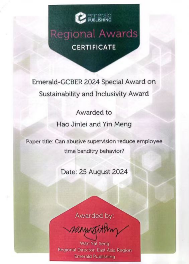 伟德官网工商管理学院郝金磊教授、会计学院教师马虎兴讲师、经济学院教师马国栋助教参会并分别作了《管理失范对员工时间侵占行为的影响》《百年变局下中国参与全球经济治理的机遇、挑战及应对策略》《生产要素价格对中国制造业国际竞争力的影响》的交流发言。同时,郝金磊教授的论文荣获英国著名学术出版机构爱墨瑞得(Emerald)集团联合博特拉大学颁发的2024年可持续性和包容性特别论文奖。