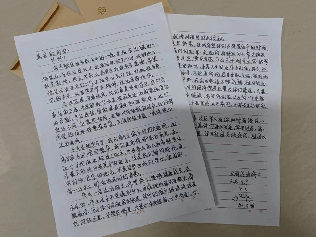 念念不忘,必有回响。近期,支部同学们收到了戍边战士的回信,一封封回信包含热诚,既有为国戍边的荣耀,又有坚守国门的职责,还有对同学们未来学习生活的祝福,纯朴真挚的情感十分动人。