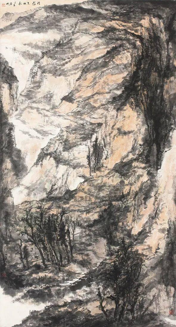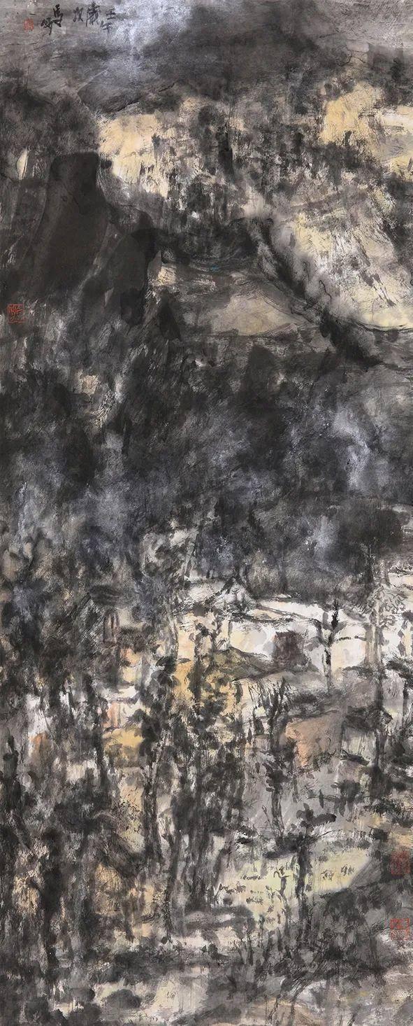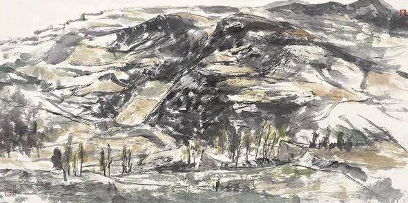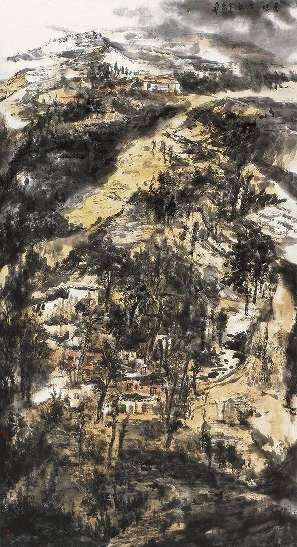 “西北”既是一个地域概念,又是一个文化概念,壮美、坚毅、高贵的精神意象融汇着西北的历史文脉。承接着北宗山水对景造意的“真骨”与“传神”,也延续着长安画派的“浑厚”与“博大”。逐渐生发着马刚对自然、对生命的体验和感悟,其艺术创作有了一个爆发性的集中呈现。《西陇山居》(2003)采用长卷的山体,横向构图,将散点透视的平面价值与焦点透视的聚焦价值交汇,视觉观感不同于中国传统卷轴山水画的移步换景,村居院落的焦点定位在主观上营造了一种生生不息的生命感悟。《村映寒塬日已斜》(2003)是西北村落自然古朴的美在内心深层的温情触摸,表现出一种宁静内敛的精神态度和人格景观,沉静的色调烘托出精神家园的抚慰。《苍塬古韵》(2003)对西北的幽邃神秘通过墨色丰富性做了探索,酣畅淋漓的笔墨挥写暗示出黄河高原的意象,表现了西北的壮阔与张力。《浩然天地秋》(2007)将黄土高原断层结构在视觉上有一种纵深向上的导引,打破了现实形态空间,将黄土特有的苍茫之境与平面结构延伸到画面之外。《晚来天欲雪》(2003)中自然荒寒和山体植被在笔墨上保持了“浑融”,丙烯、矿物颜料与中国画水性材料润泽的调度,指向人与自然的抗争与接纳,使内敛的压抑和张扬的舒展冲突在理想的精神空间得到化解。