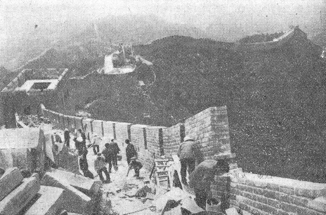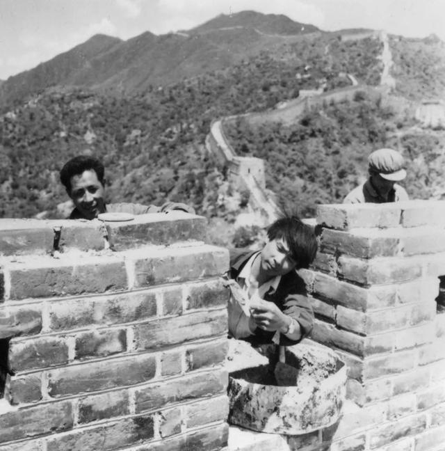 △1984年8月,“爱我中华,修我长城”社会赞助活动北京八达岭长城北七、北八两城台的修复工程正在施工。图为工人们正在修整第七城台的一段城墙。